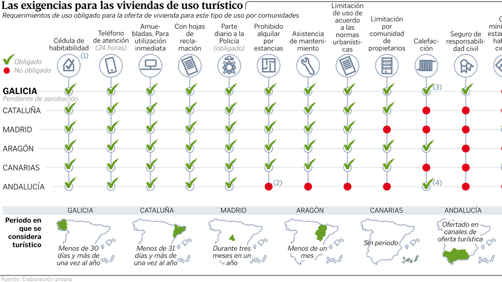 El decreto creado por la Xunta para regular las viviendas turísticas sigue la estela de la normativa catalana, así lo pusieron de manifiesto fuentes de la Consellería de Turismo y así se constata en el gráfico de esta página. Entre estas dos regulaciones solo existen dos diferencias, que en Cataluña no es obligatorio que estas casas dispongan de calefacción ni de seguro de responsabilidad civil.