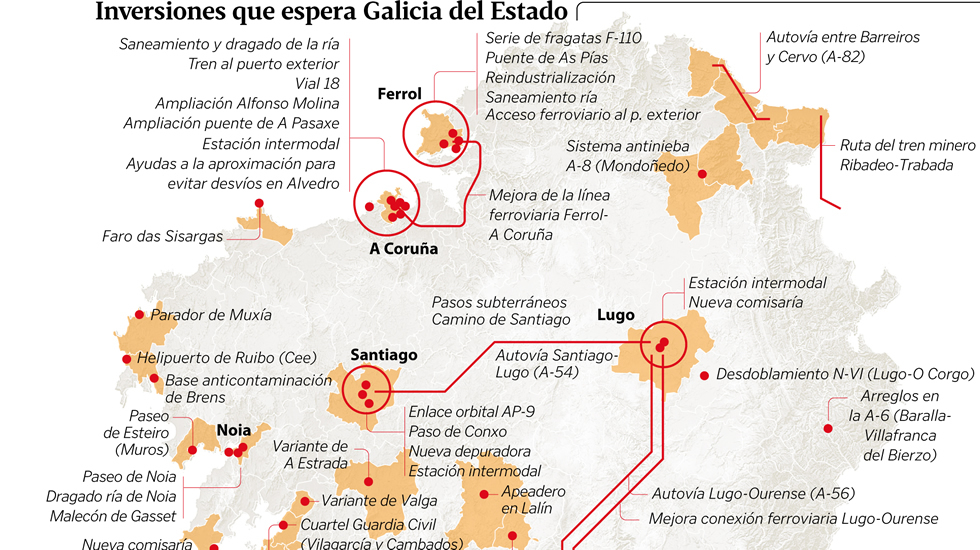 Esta inclinación del poder inversor del Estado hacia el este, condicionado también por el pacto de Ciudadanos -muy insistente en la idea de relanzar el eje ferroviario mediterráneo- y por la necesaria colaboración del PNV en la aprobación de los Presupuestos -también Canarias juega este partido- no es el único factor que hará que las inversiones bajen en Galicia, algo que dan por supuesto distintas fuentes consultadas, con información de primera mano sobre las partidas que por el momento se proyectan para la comunidad. Este año, que será el más duro en la carrera para cumplir los objetivos de déficit de Bruselas, Ciudadanos ha presionado para lograr una relevante inversión social -unos 2.000 millones más, que indirectamente también beneficiarán a Galicia-. Y se une a este contexto el alarmante déficit de la caja de la Seguridad Social, que deberá nutrirse de recursos estatales. También hay otros 2.000 millones para modernizar el tejido económico y la ambiciosa oferta pública de empleo para los próximos años tendrá efecto presupuestario.